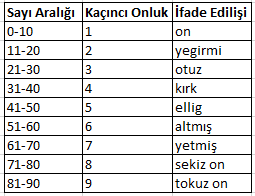 O zaman 59 sayısını ifade etmek istersek 59 bu tabloya göre bizim altıncı onluğumuzun 9. sayısı ve şu şekilde yazabiliriz : tokuz altmış
